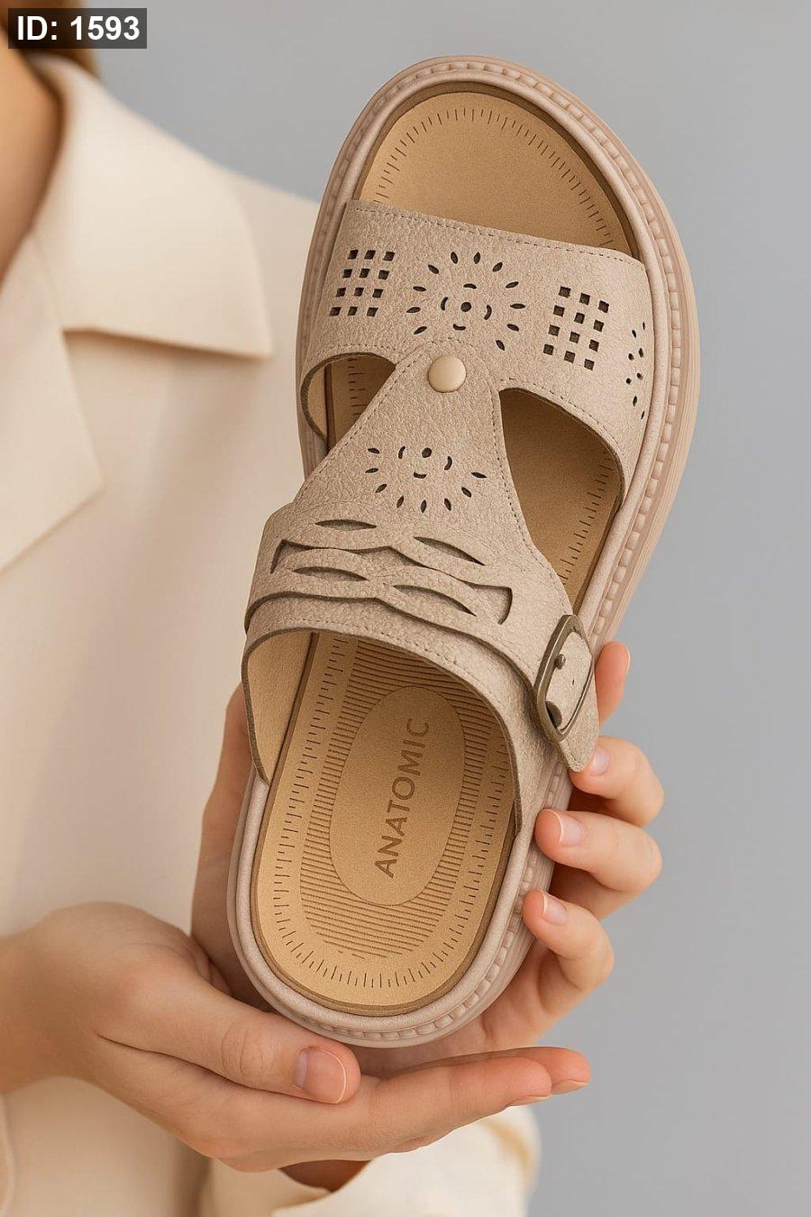 صندل عملي بتصميم أنيق مصنوع من جلد صناعي عالي الجودة باللون البني الدافئ، مع فتحات وزخارف جذابة تضيف لمسة عصرية مميزة.