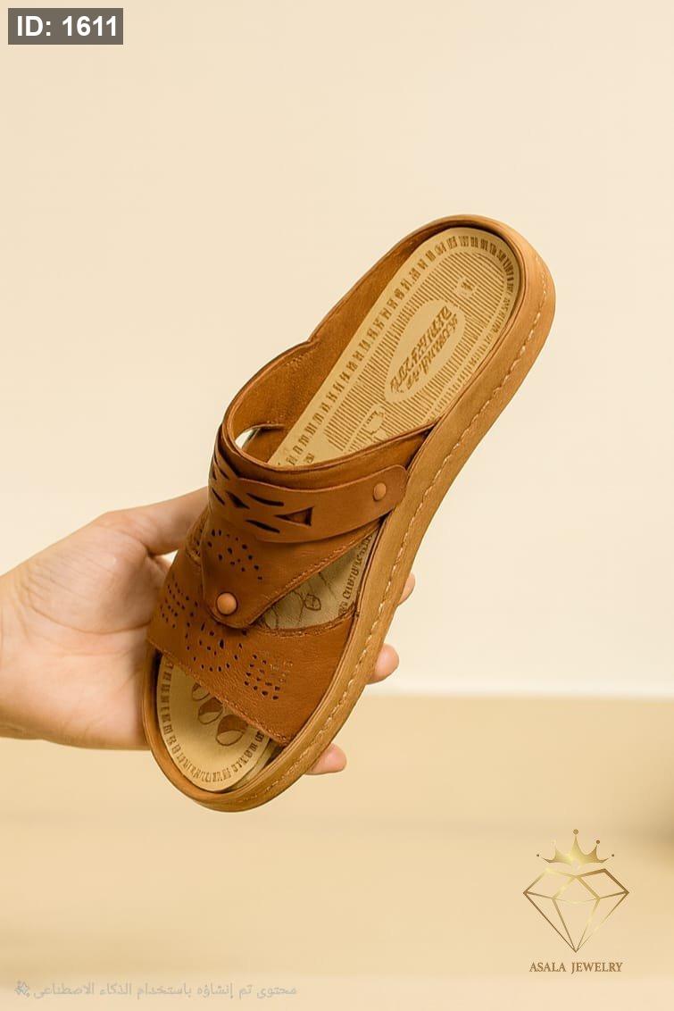 صندل عملي بتصميم أنيق مصنوع من جلد صناعي عالي الجودة باللون البني الدافئ، مع فتحات وزخارف جذابة تضيف لمسة عصرية مميزة.
