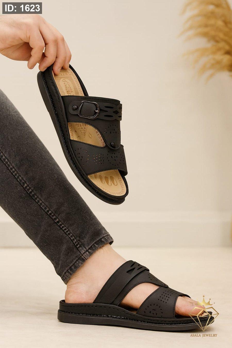 صندل عملي بتصميم أنيق مصنوع من جلد صناعي عالي الجودة باللون البني الدافئ، مع فتحات وزخارف جذابة تضيف لمسة عصرية مميزة.