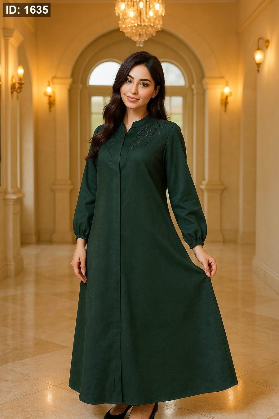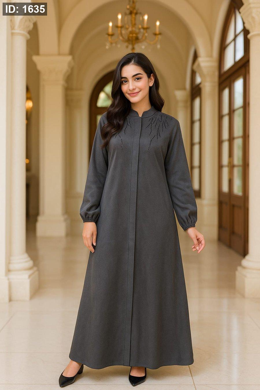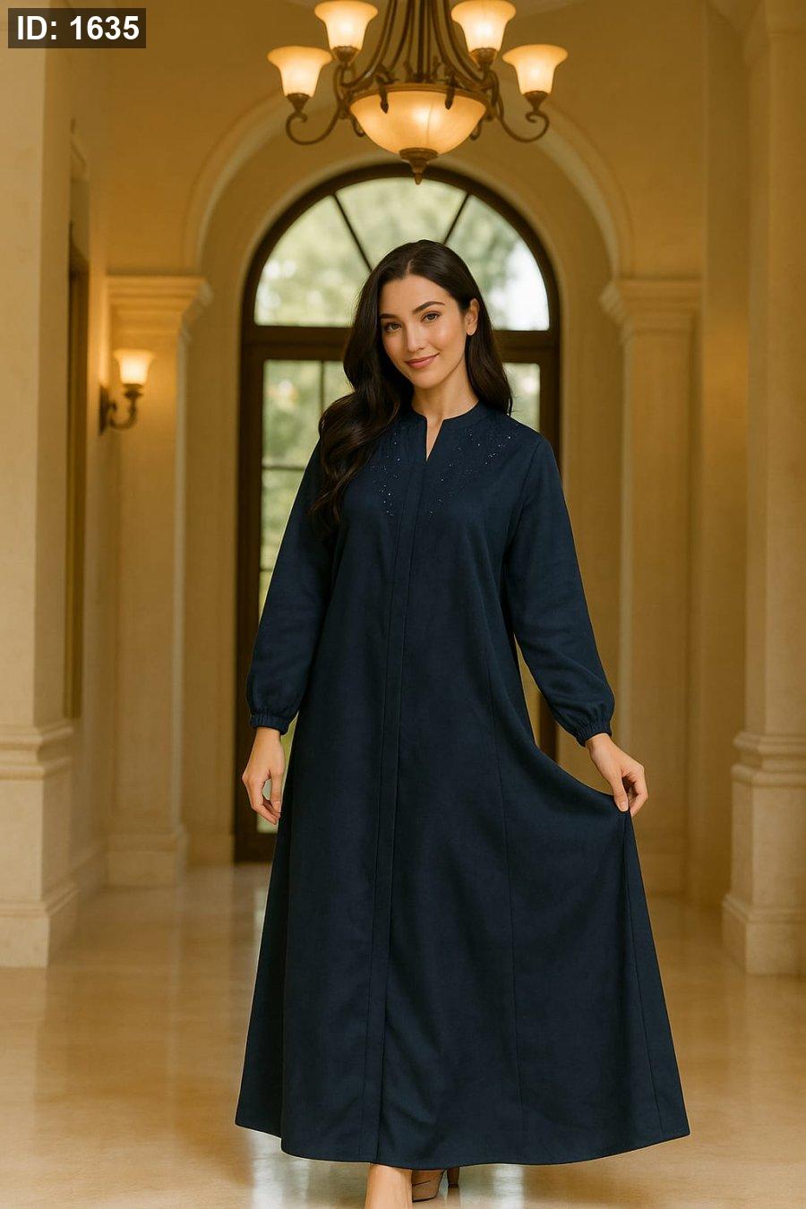 جلباب أنيق ومحتشم مصنوع من خامة شيمواه فاخرة شتوية تمنحك الدفء والراحة في آنٍ واحد. تصميم راقٍ بلون أسود كلاسيكي مزين بتطريز بسيط على الأكمام والأزرار الأمامية، يمنحك إطلالة فخمة وناعمة في نفس الوقت.