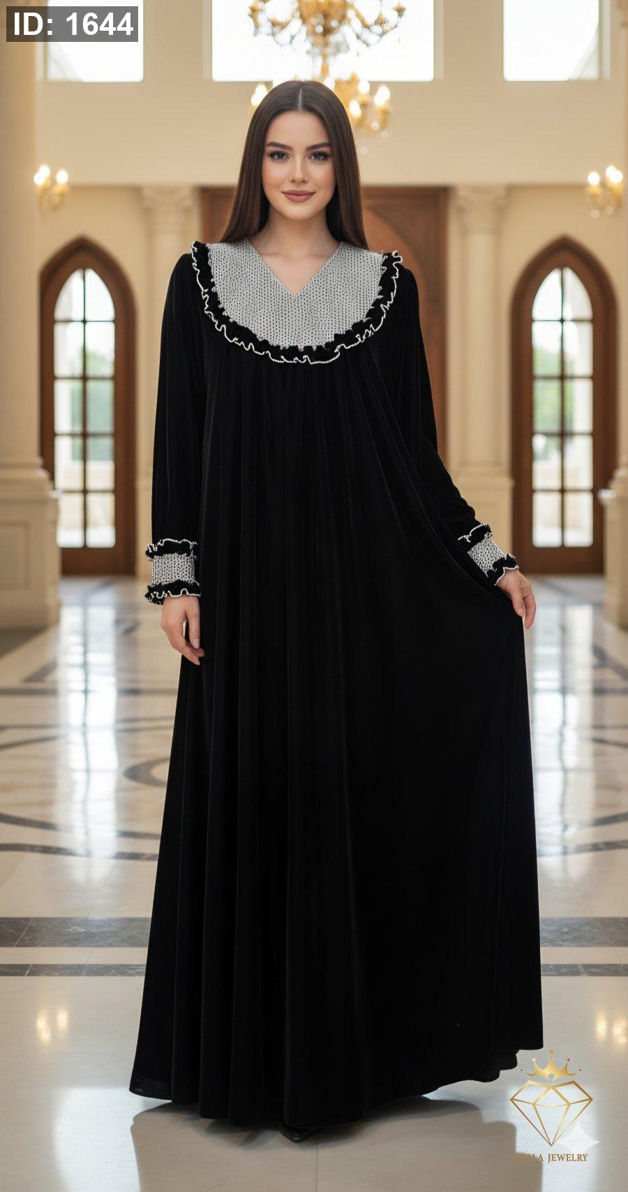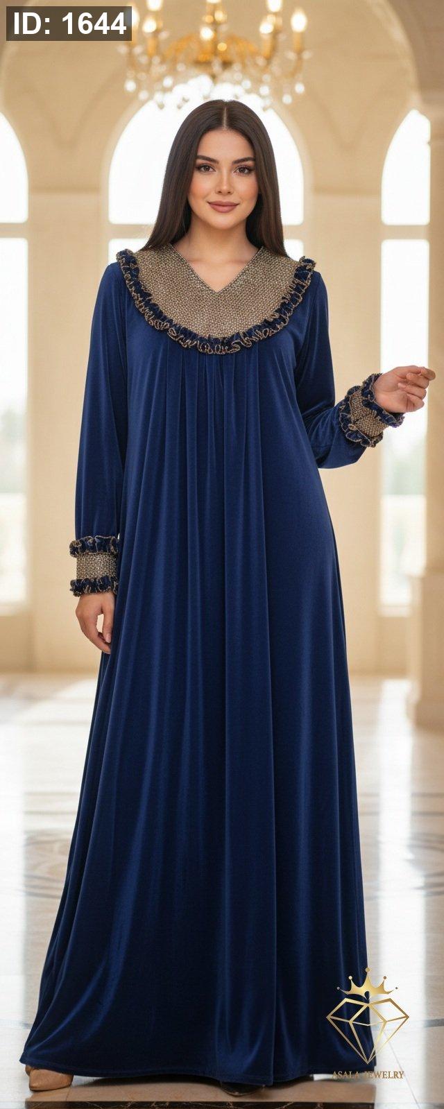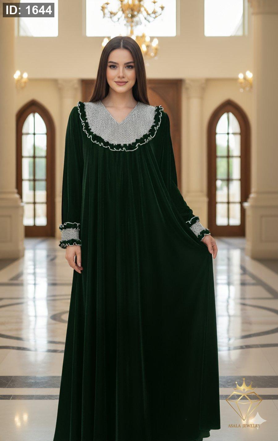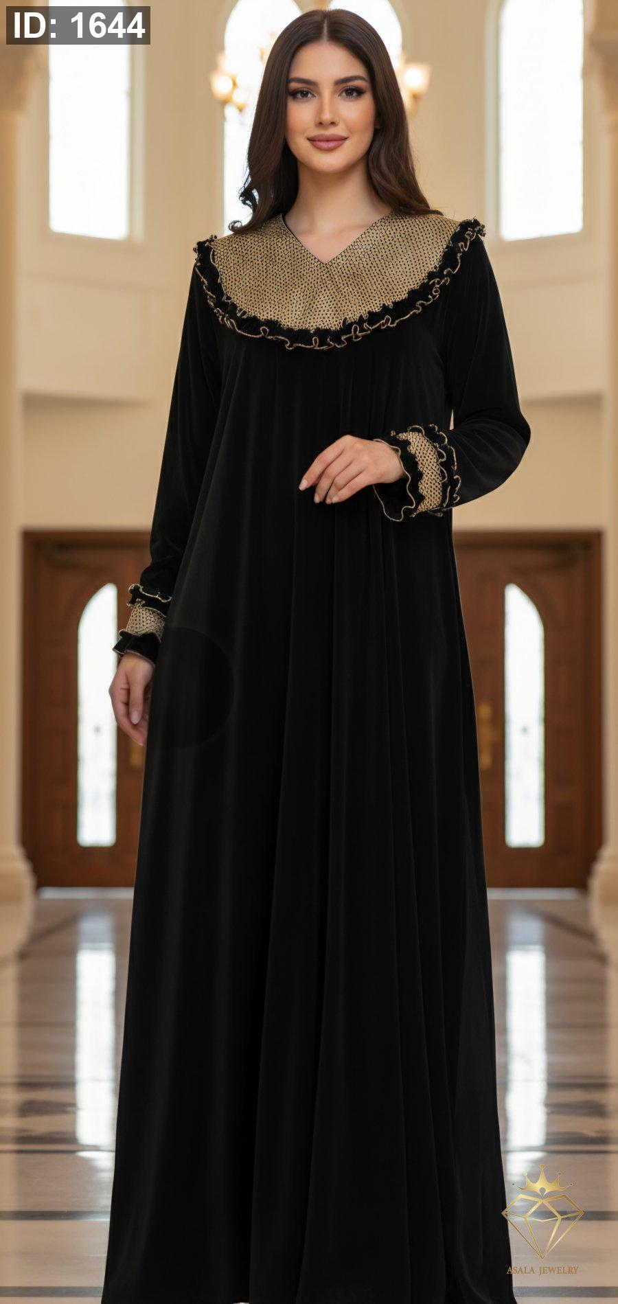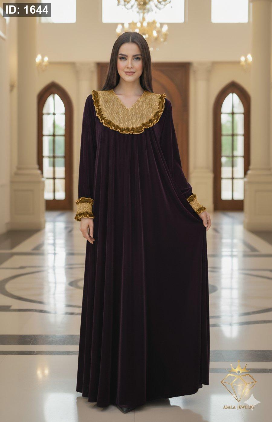 تألقي بسحر الأناقة مع هذا الفستان المخملي الفاخر، المصمم ليمنحك إطلالة ملكية لا تُنسى. يتميز الفستان بقصته الطويلة الانسيابية وأكمامه الطويلة التي تضفي لمسة من الرقي، بينما تتجلى فخامته في الياقة الذهبية المزدانة بالتطريز اللامع والمنسجمة مع تفاصيل الأكمام الأنيقة.