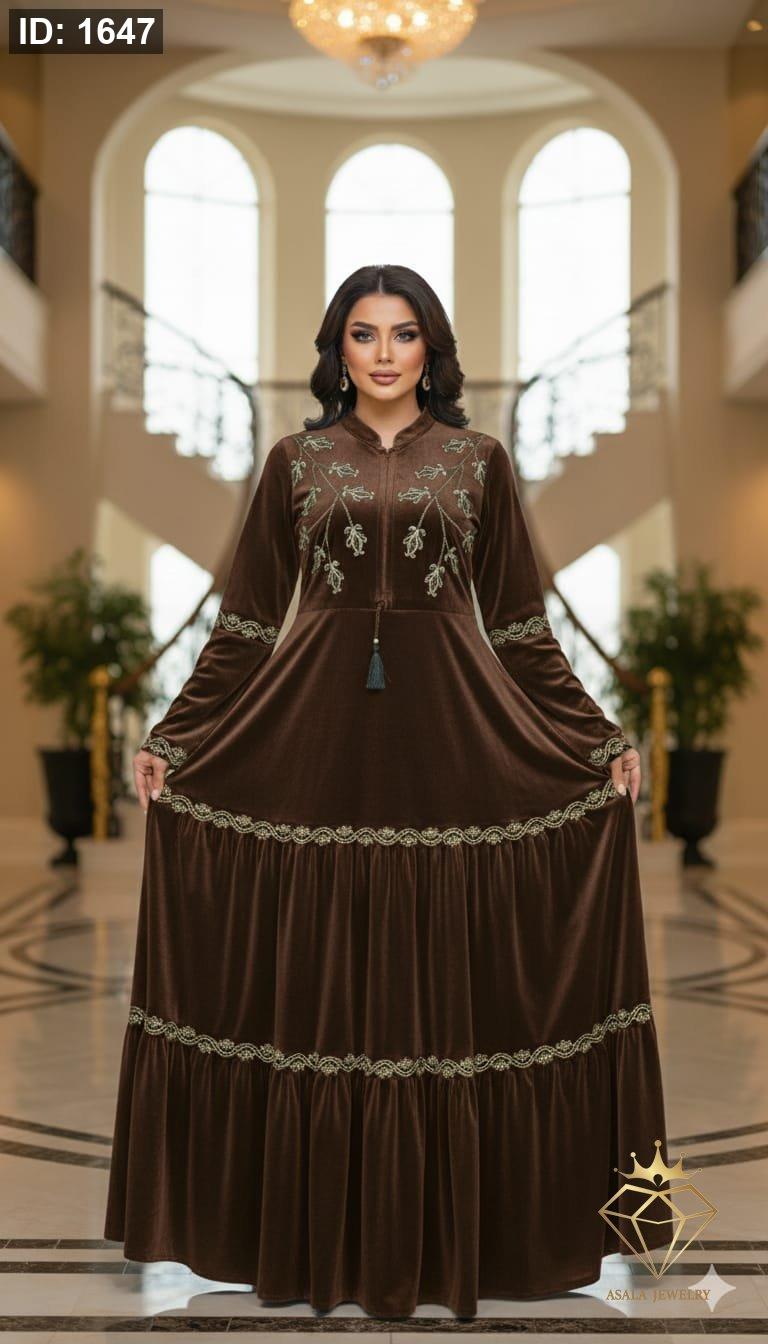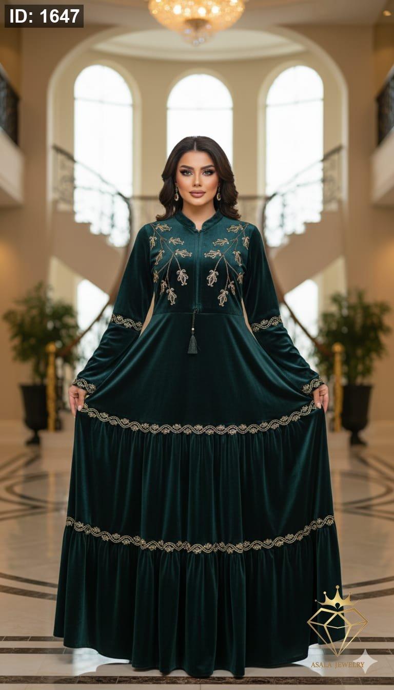 خامة المخمل الفاخرة: مصنوع من أجود أنواع المخمل الناعم الذي يمنحكِ شعورًا بالراحة ويضفي بريقًا خاصًا على إطلالتكِ. تطريز ذهبي أنيق: يزدان الجزء العلوي من الفستان بتطريزات ذهبية دقيقة وراقية، تضفي لمسة من الفخامة وتجذب الأنظار. أكمام واسعة ومريحة: الأكمام الطويلة بتصميمها الواسع والمريح تسمح بحرية الحركة وتضيف لمسة عصرية للفستان. تصميم الطبقات المتدرجة: الجزء السفلي من الفستان مصمم بطبقات متدرجة ومزينة بخطوط ذهبية رفيعة، مما يمنح الفستان حجمًا أنيقًا وحركة جميلة.