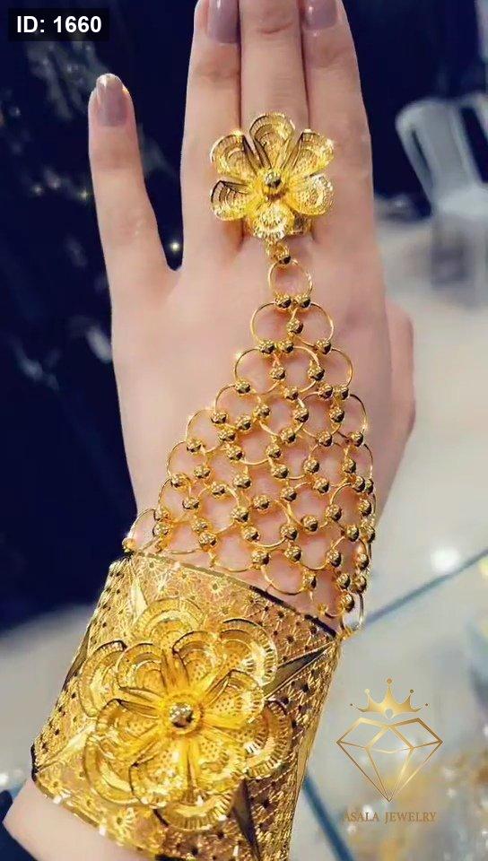 السوار: يتميز الجزء الخاص بالمعصم بتصميم عريض ومتقن يضم مجموعة من الزهور أو الورود الذهبية البارزة ثلاثية الأبعاد، محفورة بدقة ومتصلة ببعضها البعض، مما يضفي لمسة فخامة وغنى. الجزء الشبكي: يمتد من السوار إلى الخاتم نسيج شبكي متراكم على ظهر الكف. هذا النسيج مكون من حلقات ذهبية صغيرة ومتشابكة، ومُزين بحبيبات أو كرات ذهبية دقيقة عند نقاط التقاطع، مما يعطي مظهرًا براقًا ومرنًا. الخاتم: ينتهي التصميم بخاتم أصبع واحد مزين بوردة ذهبية مماثلة لتلك الموجودة على السوار، ليكمل الترابط والتناسق بين أجزاء القطعة. الخامة: مصنوعة من الذهب الأصفر. المناسبة: مثالية للمناسبات الكبيرة، الأعراس، الخطوبة، أو كهدية زفاف مميزة.