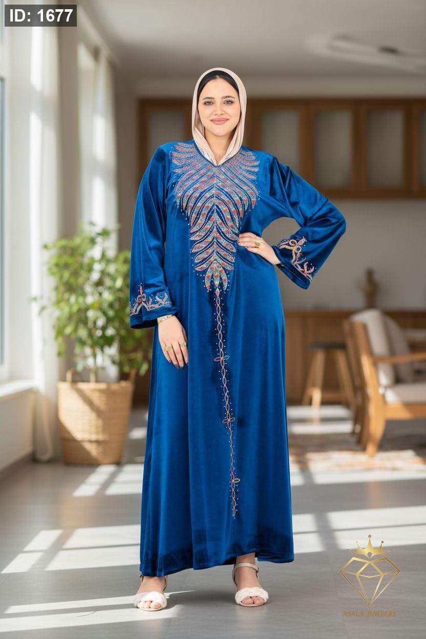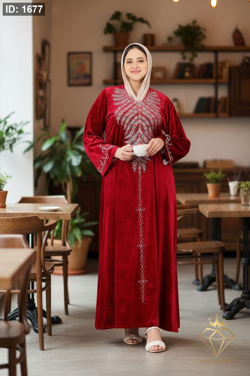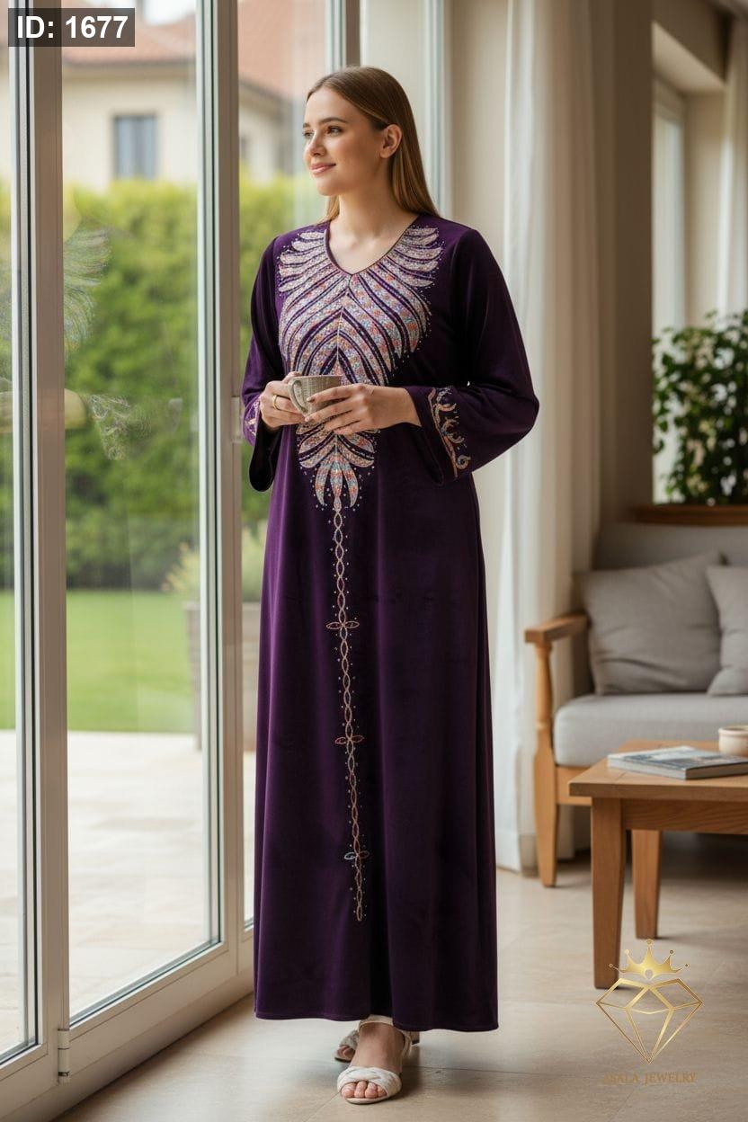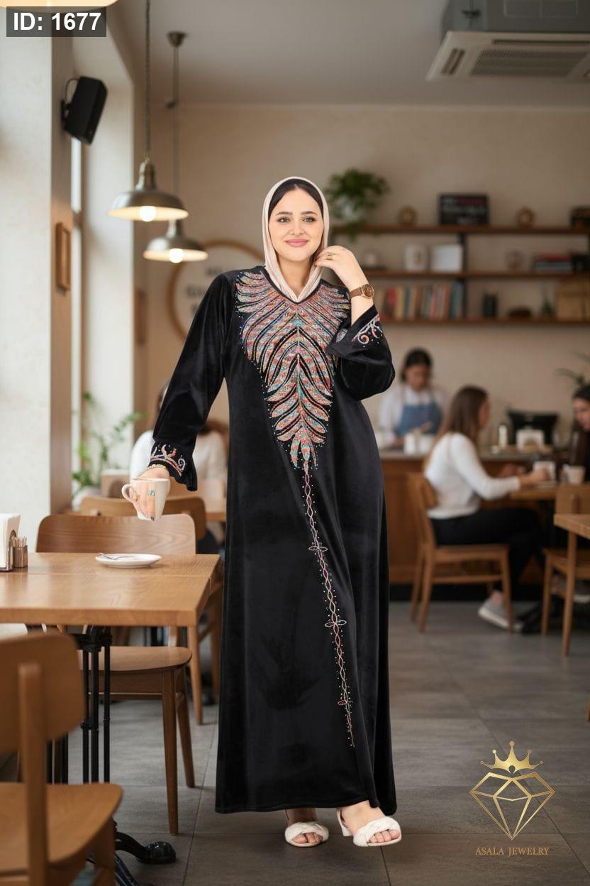 الخامة: مخمل ناعم وفاخر يوفر دفئاً مثالياً لموسم الشتاء والخريف. التصميم: يتميز بتطريز غني ومتقن يمتد من منطقة الصدر على شكل سبعة (V-neck) نزولاً في خط مستقيم على طول العباءة. تظهر لمسة من التطريز المماثل على أطراف الأكمام. الأناقة والاحتفال: مثالية كـ قفطان شتوي أو جلابية استقبال أو لباس سهرة محتشم. الألوان المتوفرة: الأحمر العنابي (أو البورغندي)، البنفسجي الداكن، الأزرق الملكي، الأسود الكلاسيكي، والرمادي المائل للبيج (Taupe). المميزات: قصة فضفاضة ومريحة تناسب مختلف القياسات. ممكن ارتداؤها مع أو بدون حجاب (كما تظهر في الصور). تجمع بين العراقة الشرقية والتصميم العصري.
