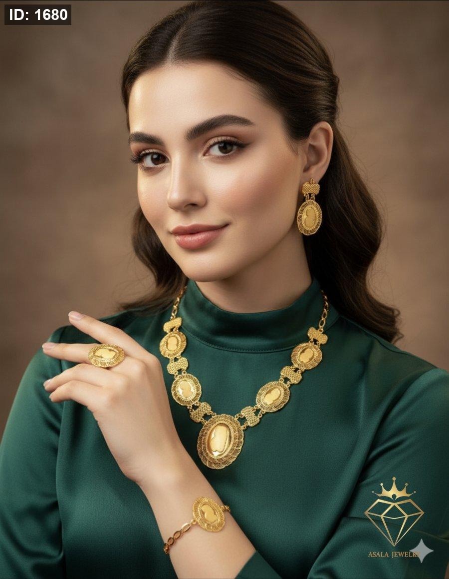 أضيفي لمسة من الفخامة الأبدية إلى إطلالتك مع طقم مجوهرات "الوهج الذهبي" الأنيق. يتميز هذا الطقم بتصميم كاميو كلاسيكي يجسد جمال الفن الروماني القديم، مع تفاصيل ذهبية متقنة تضفي بريقًا لا مثيل له. يشتمل الطقم على قلادة مركزية بتصميم بيضاوي كبير، تتناسق بأناقة مع أقراط متدلية، سوار رقيق، وخاتم مميز، جميعها مرصعة بقطع الكاميو الفريدة ومصنوعة بدقة عالية لتوفر لكِ مظهرًا راقيًا ومتكاملًا. مثالي للمناسبات الخاصة، الحفلات، أو لإضفاء لمسة من الرقي على إطلالتك اليومية. تصميم يجمع بين الأصالة والعصرية ليناسب المرأة التي تقدر الجمال والتفرد.