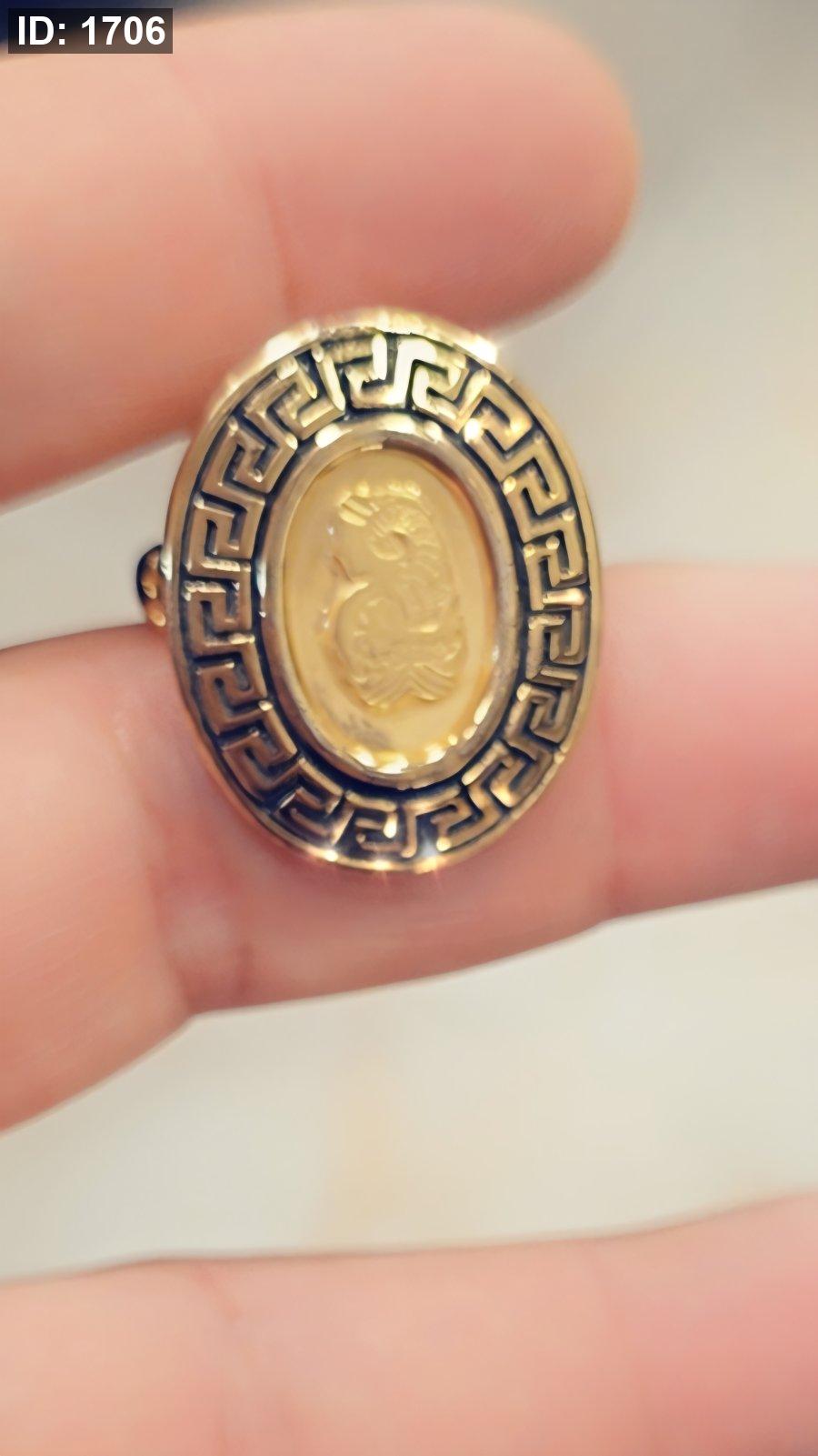 يأتي الخاتم بحجر بيضاوي بشكل "أونصة" محفور بنقشة تراثية جميلة، محاط بإطار يوناني هندسي يمنح القطعة طابعًا ملكيًا وأناقة لافتة.