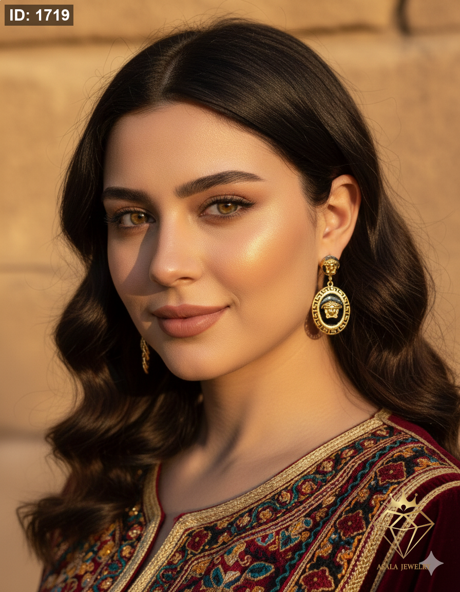 يجمع الحلق بين إطار ذهبي مزخرف ونقشة مركزية فريدة تضيف للوجه حضورًا فخمًا يناسب الإطلالات التراثية والعصرية في آن واحد.