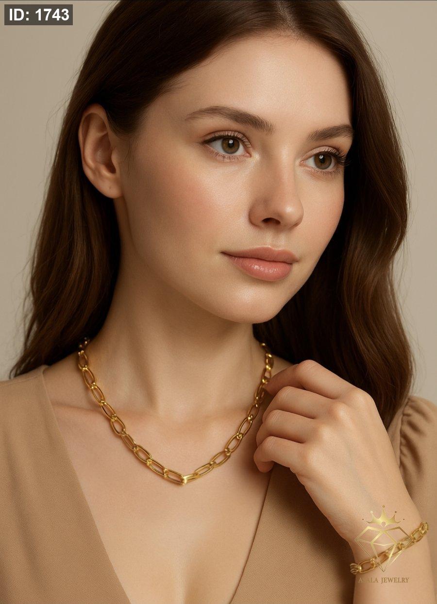 طقم بديل ذهب أنيق يجمع بين البساطة والفخامة، مكوّن من سلسال بتصميم حلقات بيضاوية متشابكة مع إسوار مطابق يمنحك إطلالة راقية ومتناسقة.