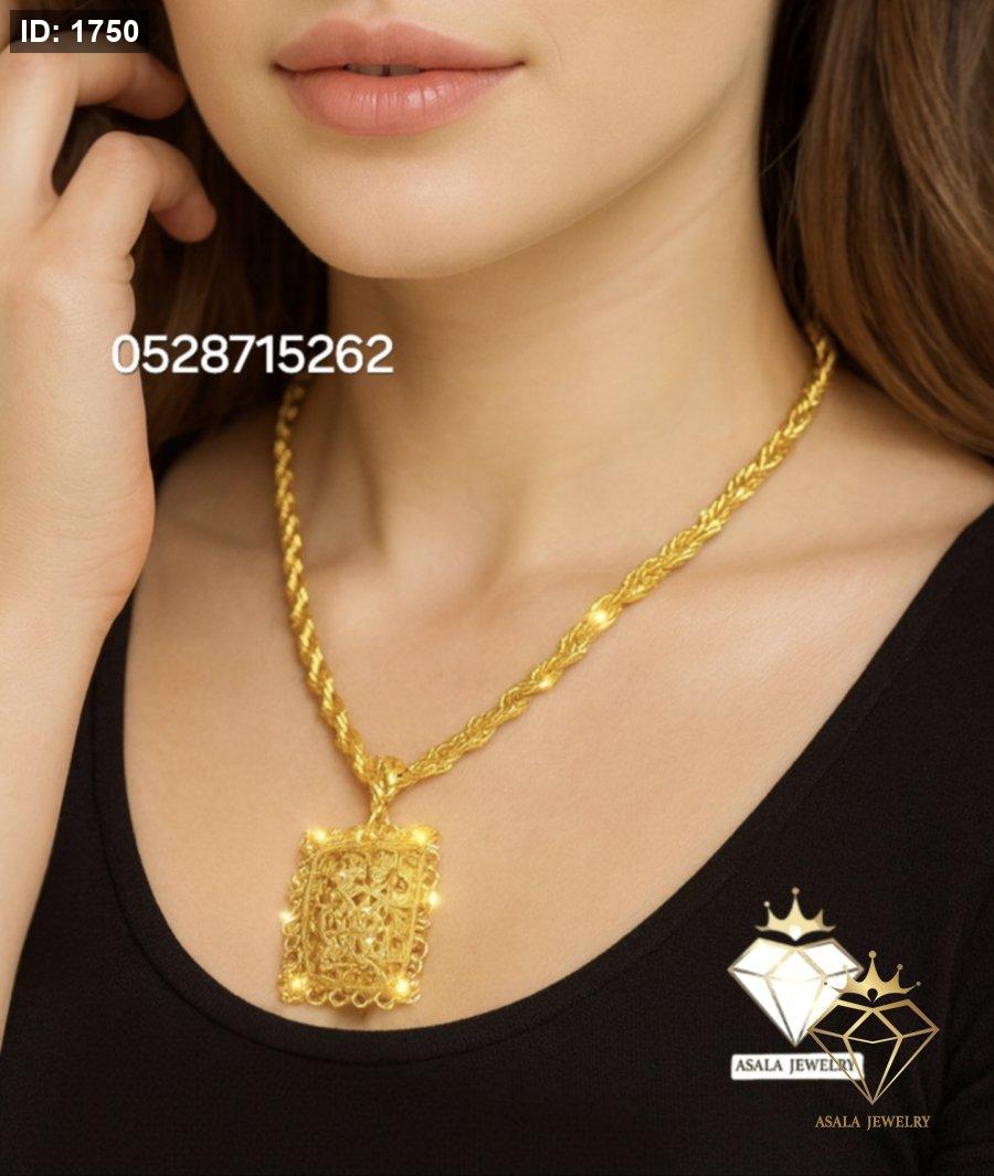 يأتي السلسال مع سلسلة حبلية سميكة ولامعة تشبه ذهب عيار 21، تتدلّى منها تعليقة مربعة محفورة بدقة عالية، محاطة بإطار مزخرف يمنح القطعة حضورًا لافتًا وفخامة لا مثيل لها.
