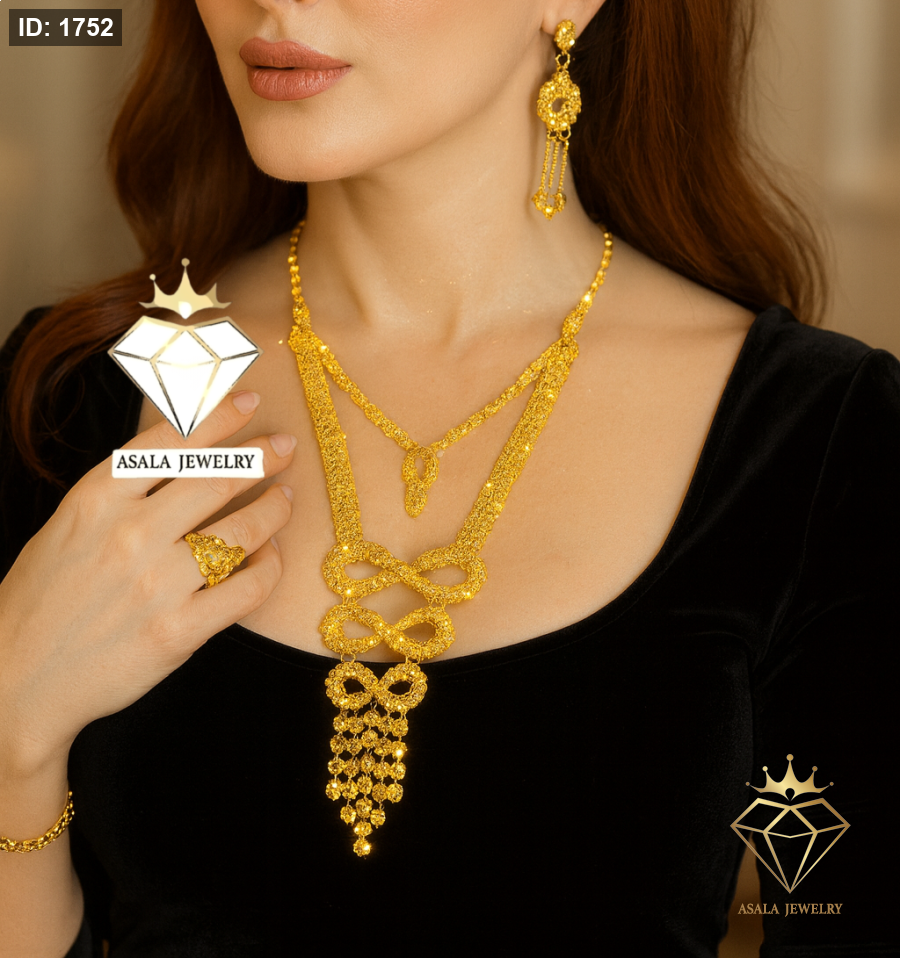 يأتي هذا الطقم الراقي بتصميم عقدة ذهبية متداخلة تمنحك إطلالة ملكية جذابة، مع لمعان قوي يشبه ذهب عيار 21 وثبات ممتاز للّون.