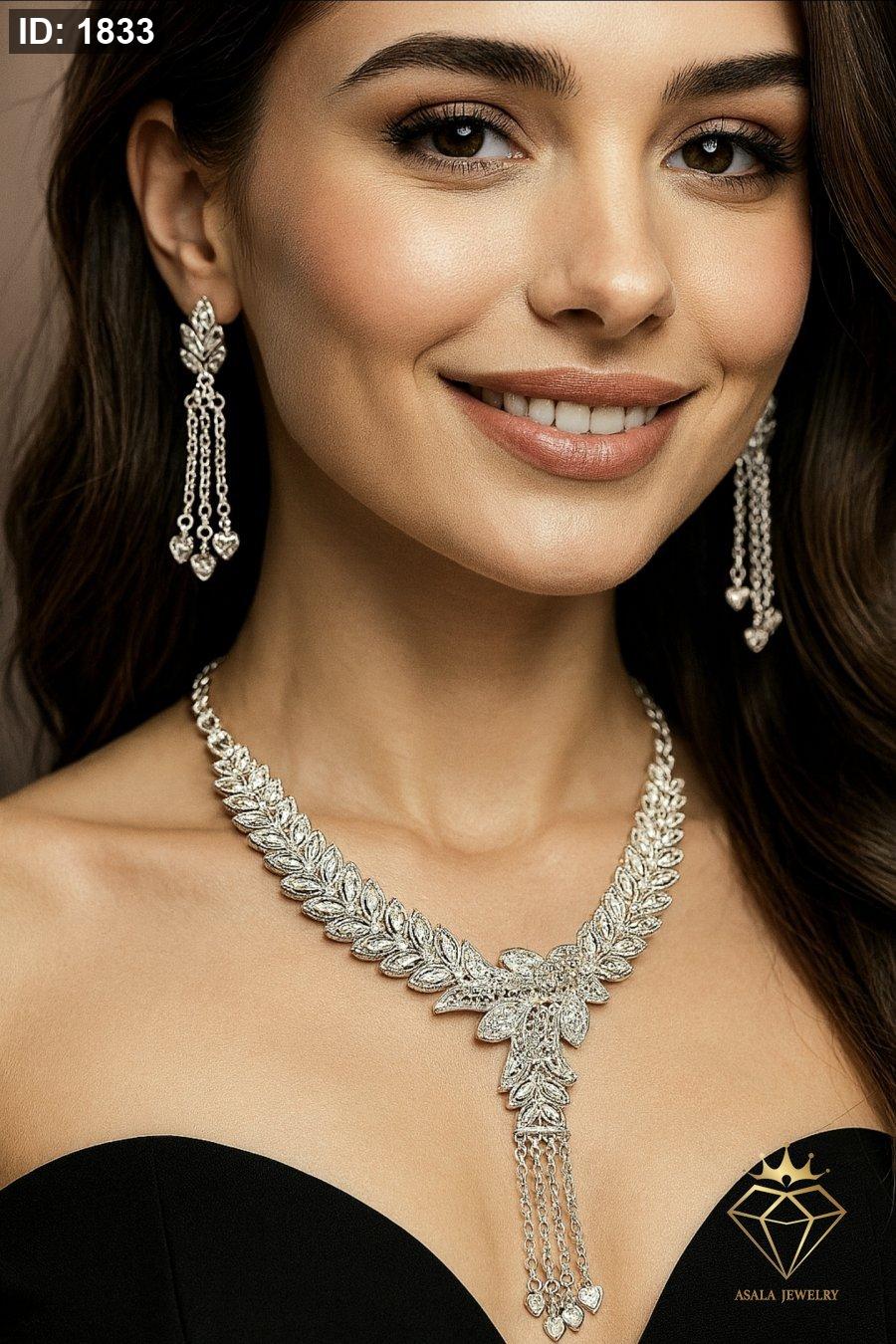 ارتقي بإطلالتك مع طقم أوراق الفخامة الفضي المصمم بلمسة أنثوية راقية تظهر جمالية التفاصيل بدقة عالية. يتكون الطقم من عقد فضي لامع مزين بأوراق متناسقة تمنح لمعانًا يشبه الفضة الأصلية، إضافة إلى حلق طويل متدلٍ يزيد من جاذبية الوجه ويمنحك حضورًا فخمًا في أي مناسبة.