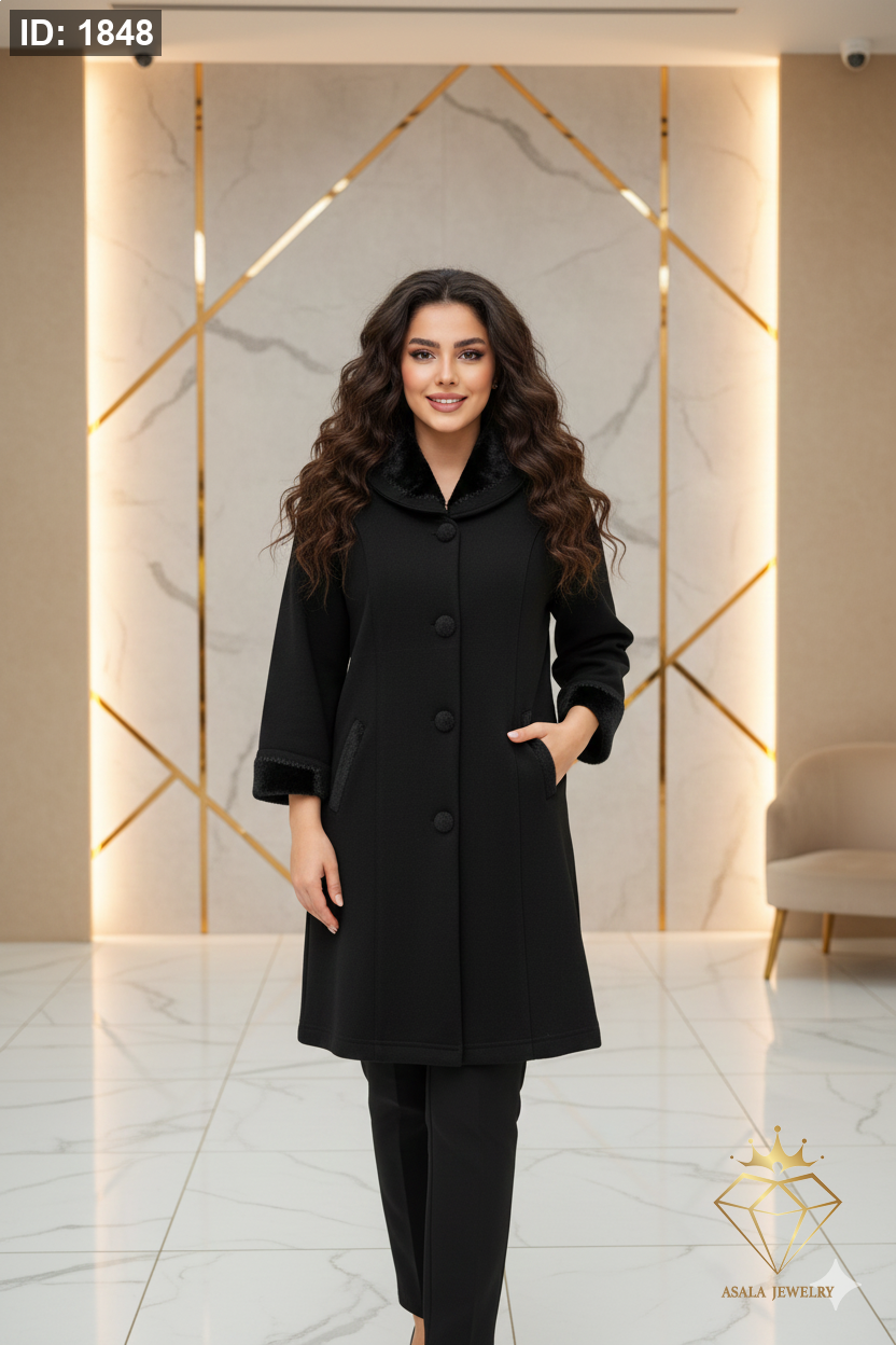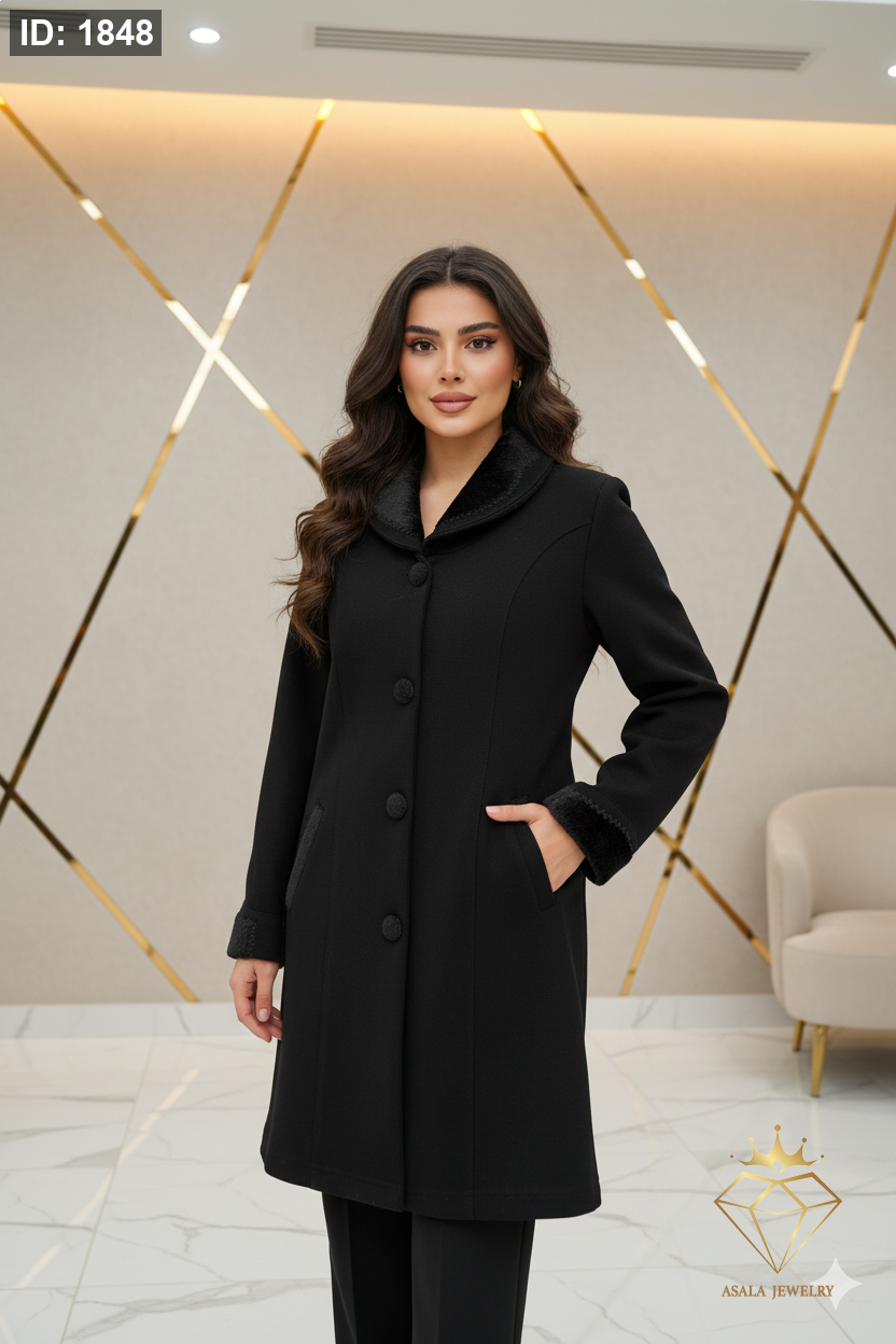 تصميم فاخر: تفاصيل فرو أنيقة حول الياقة لدفء ورقي.