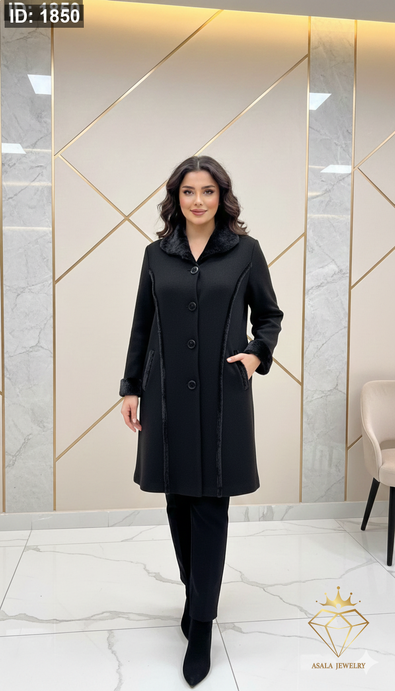 معطف شتوي نسائي فاخر مصنوع من قماش دافئ عالي الجودة، بتصميم كلاسيكي راقٍ يناسب الإطلالات اليومية والرسمية.