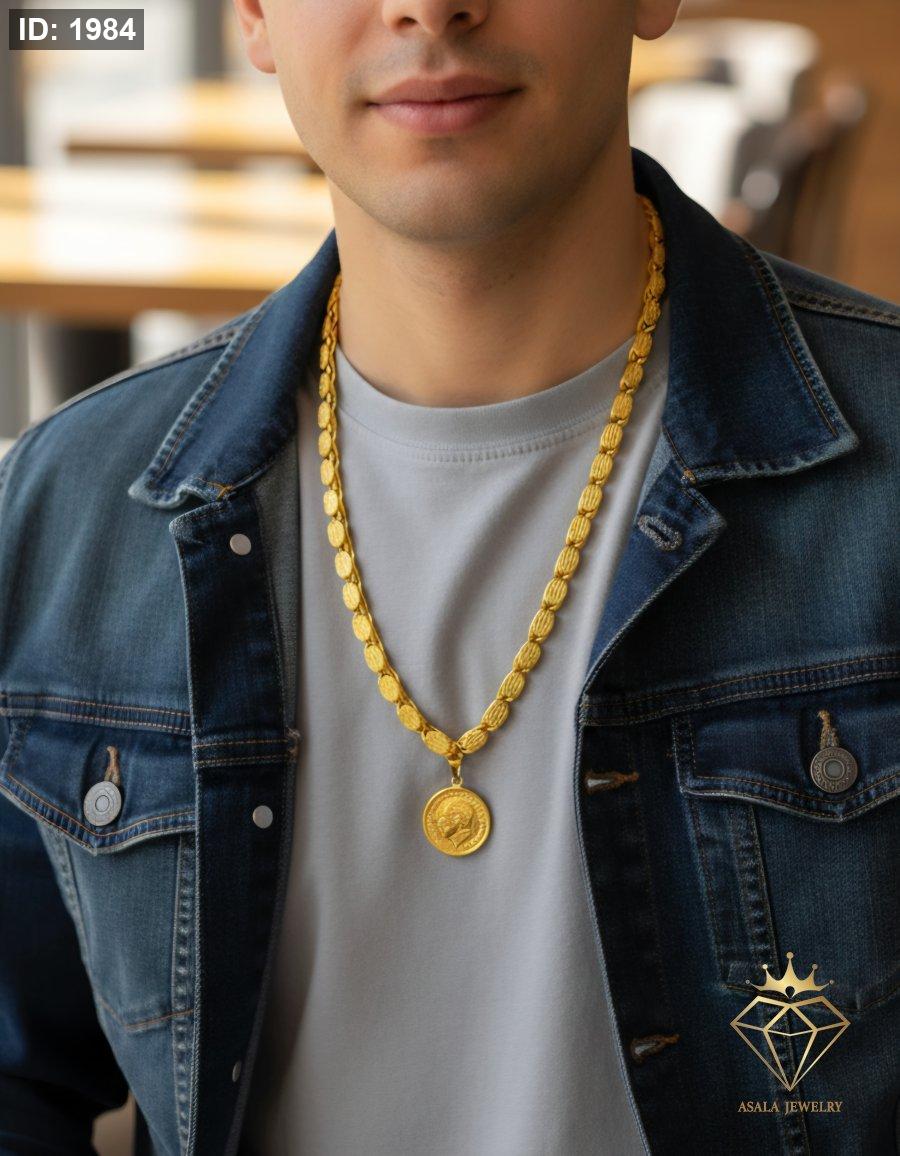 اكتشف أناقة القلادة الذهبية الرجالية بتصميم فريد. سلسلة عريضة مُتقنة تحمل تعليقة عملة ذهبية عثمانية. إكسسوار مثالي لإطلالة كاجوال