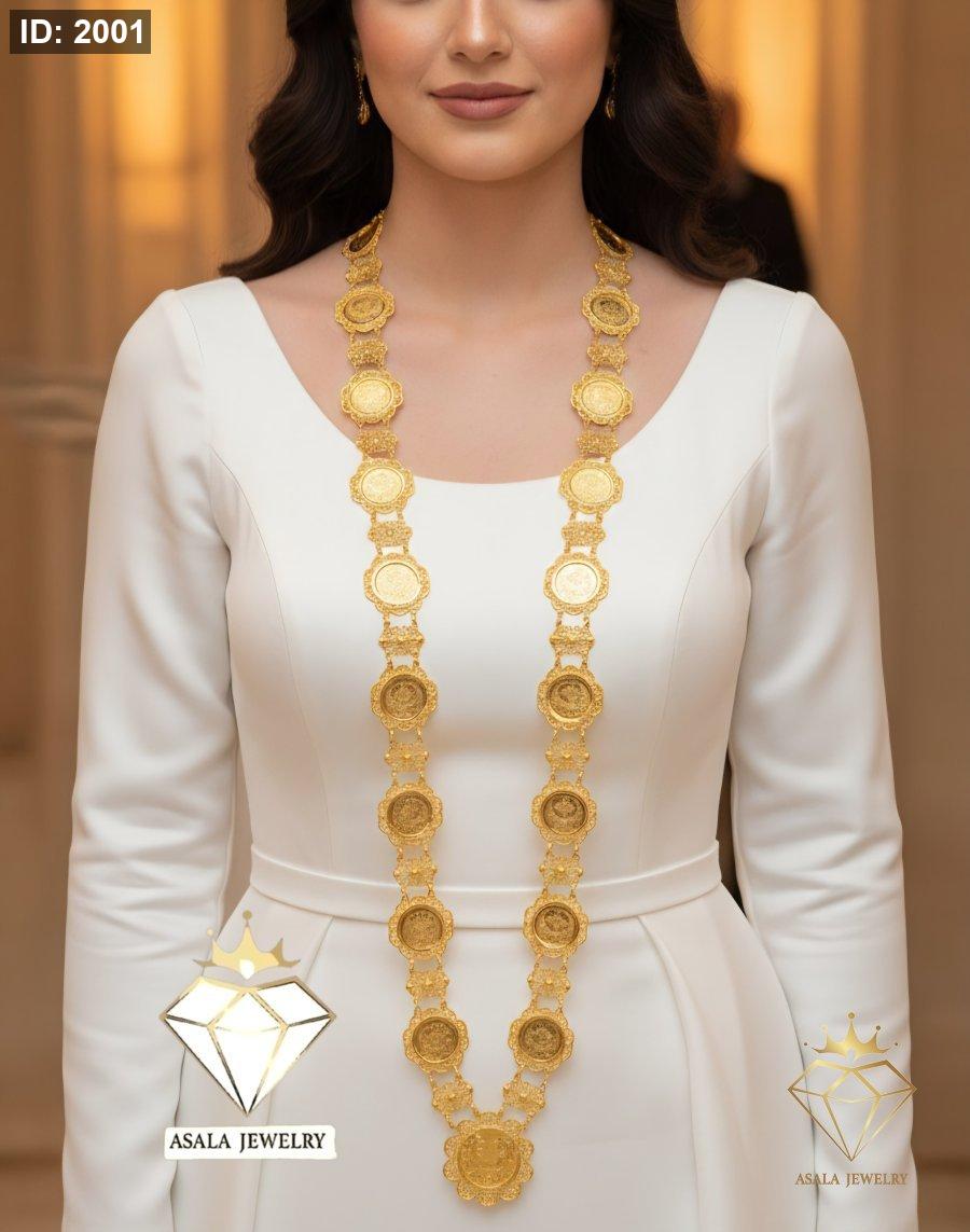 قلادة ليرات رشادي طويلة بتصميم ملكي فاخر مستوحى من الليرات الرشادية الكلاسيكية، تمنحك إطلالة ذهبية قوية وراقية مطابقة للذهب تماماً وتبرز الفخامة في كل تفصيلة.