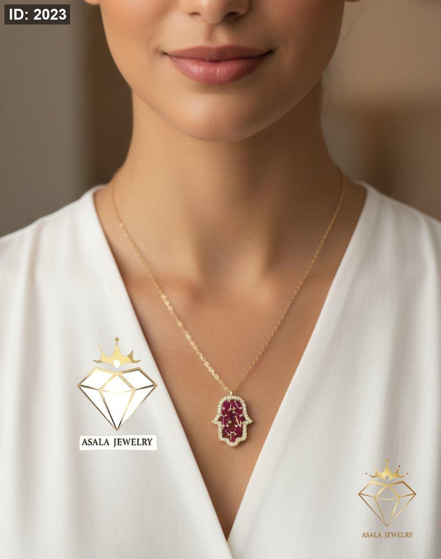 سنسال يد فاطمة بتصميم أنيق وناعم، مرصّع بحجر ملون لافت يمنح القلادة لمسة فخامة ورمزاً للحماية والجمال ✨