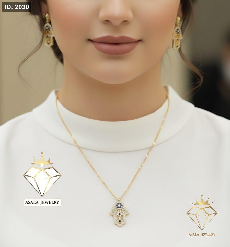 قلادة يد فاطمة بتصميم ناعم وأنيق، مرصّعة بحجر أزرق لافت يضفي لمسة هدوء ورقي ✨