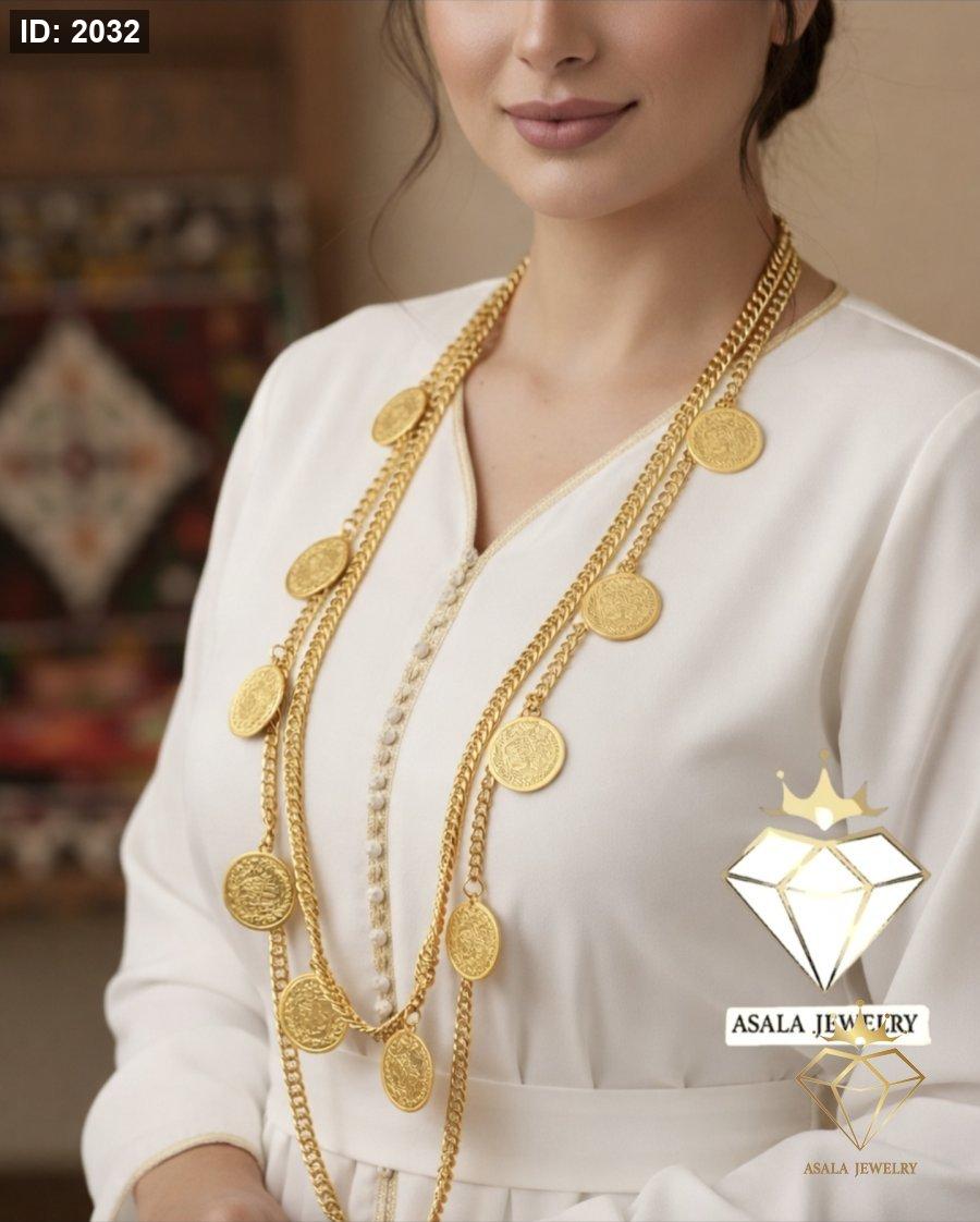 سنسال طويل بتصميم تراثي أنيق، مزوّد بعدة ليرات دائرية موزعة على سلاسل متينة تمنح القطعة حضوراً قوياً وفخامة لافتة ✨
