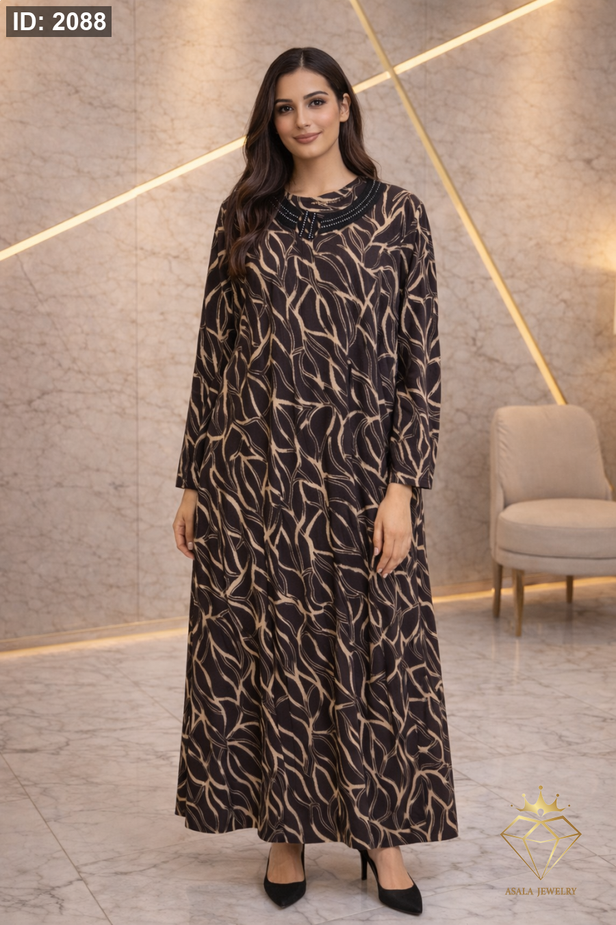 تأتي النقشة المميزة لتعكس ذوقاً راقياً وتفاصيل تضيف لمسة فخامة ناعمة، مع ياقة أنيقة وأكمام طويلة تناسب الإطلالات اليومية