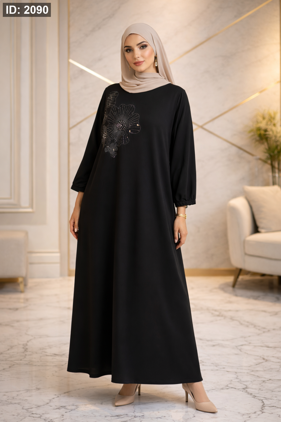 تفاصيل الزهرة المطرزة على الصدر تضيف لمسة فخامة ناعمة دون مبالغة، لتجعل الإطلالة متوازنة بين الكلاسيكية والعصرية. الأكمام العملية تمنح حرية في الحركة وتناسب مختلف الأوقات.