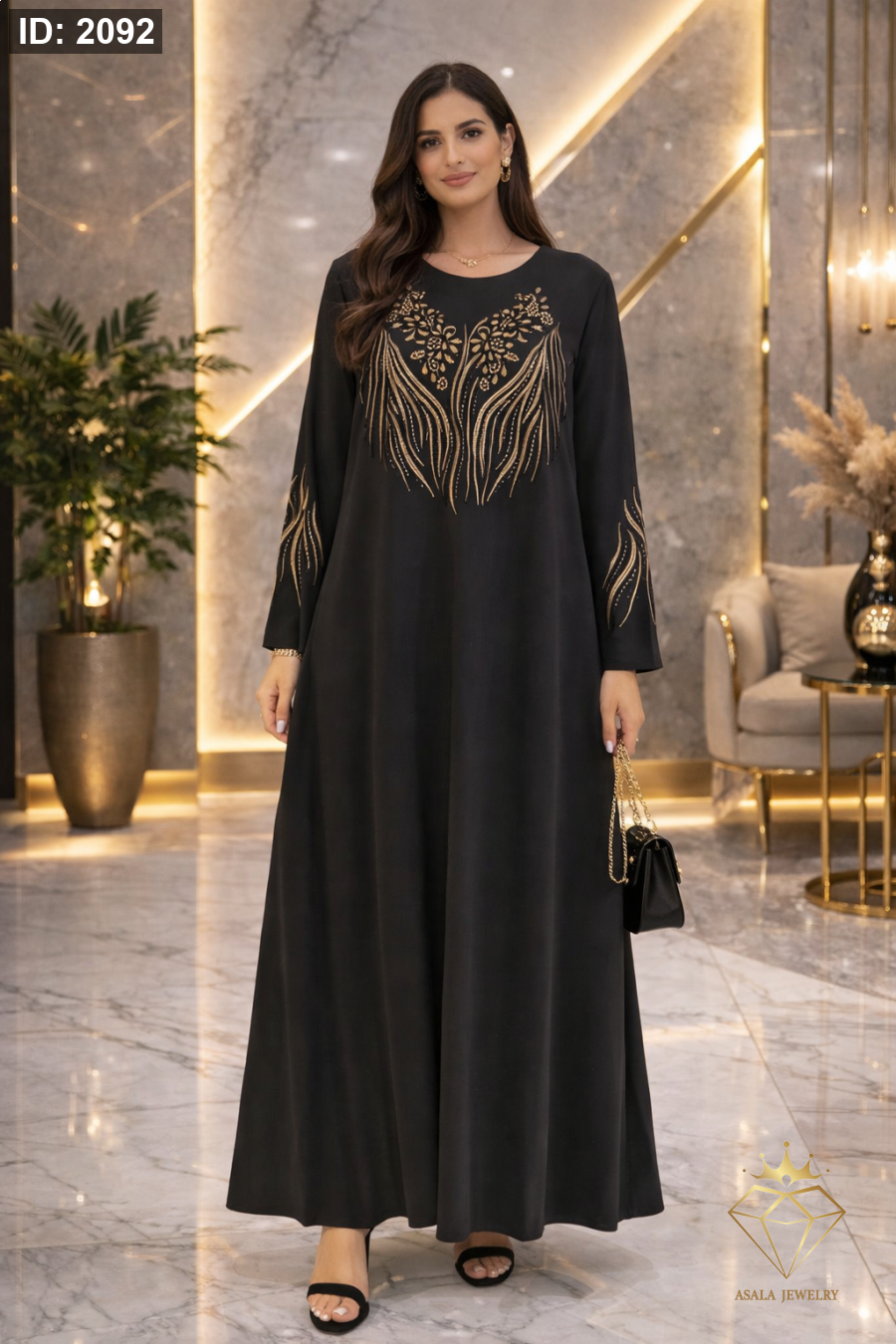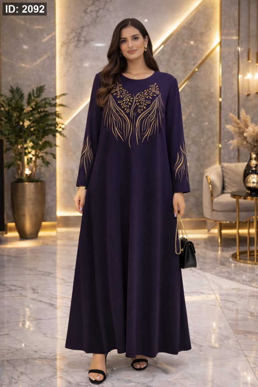 فستان طويل بتصميم راقٍ يعكس الفخامة في أدق التفاصيل. يتميز بقصّة واسعة وانسيابية تمنح حضوراً أنيقاً وثباتاً في الإطلالة، مع تفاصيل زخرفية أمامية تضيف لمسة تميز لافتة دون مبالغة.
