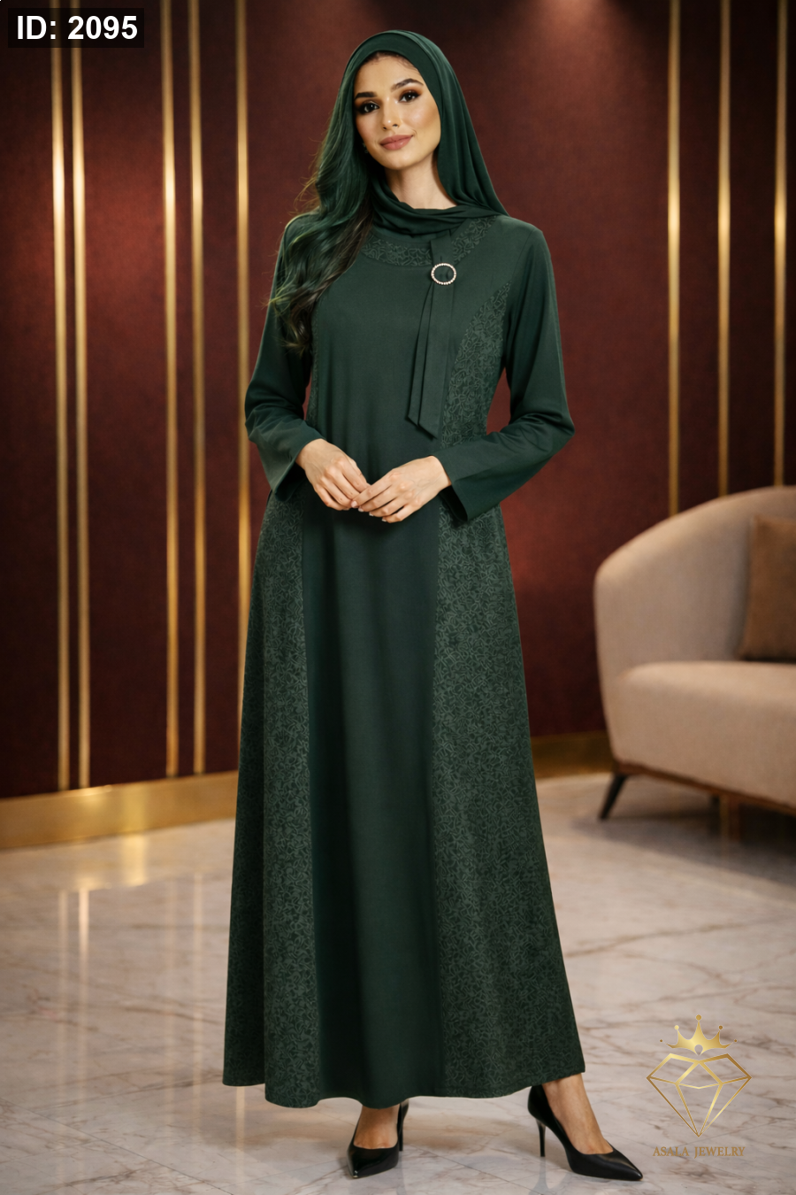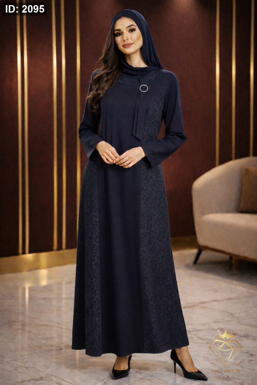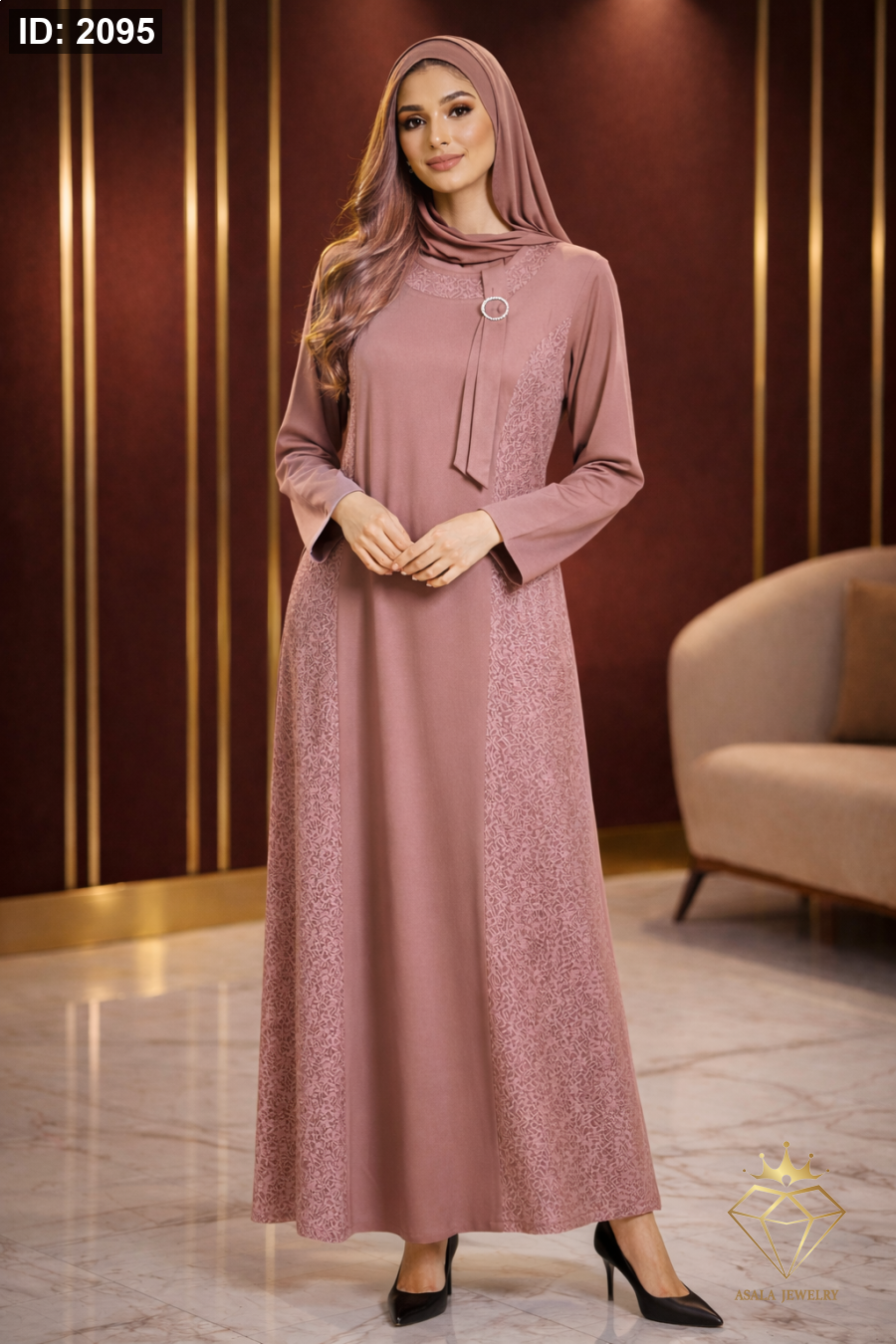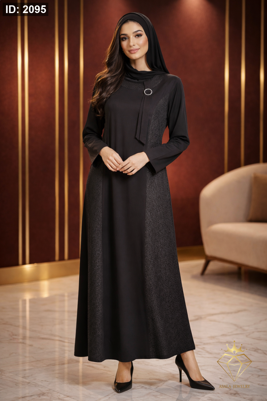فستان طويل بتصميم يجمع بين الكلاسيكية والرقي، يتميز بقصّة انسيابية واسعة تمنحك حضوراً أنيقاً وثابتاً في كل خطوة. تفاصيل جانبية ناعمة تضيف عمقاً راقياً للتصميم، مع لمسة أمامية أنيقة تعزز الطابع الرسمي للفستان.