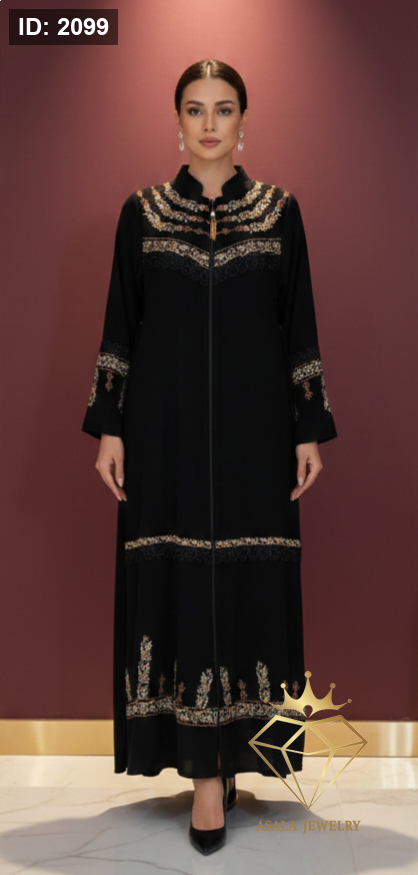 عباية طويلة بتصميم أنيق يجمع بين الأصالة والطابع العصري. تتميز بتطريزات دقيقة موزعة بانسجام على الجزء العلوي والأكمام والحافة السفلية، ما يمنحها لمسة فنية راقية تعكس الذوق الرفيع.