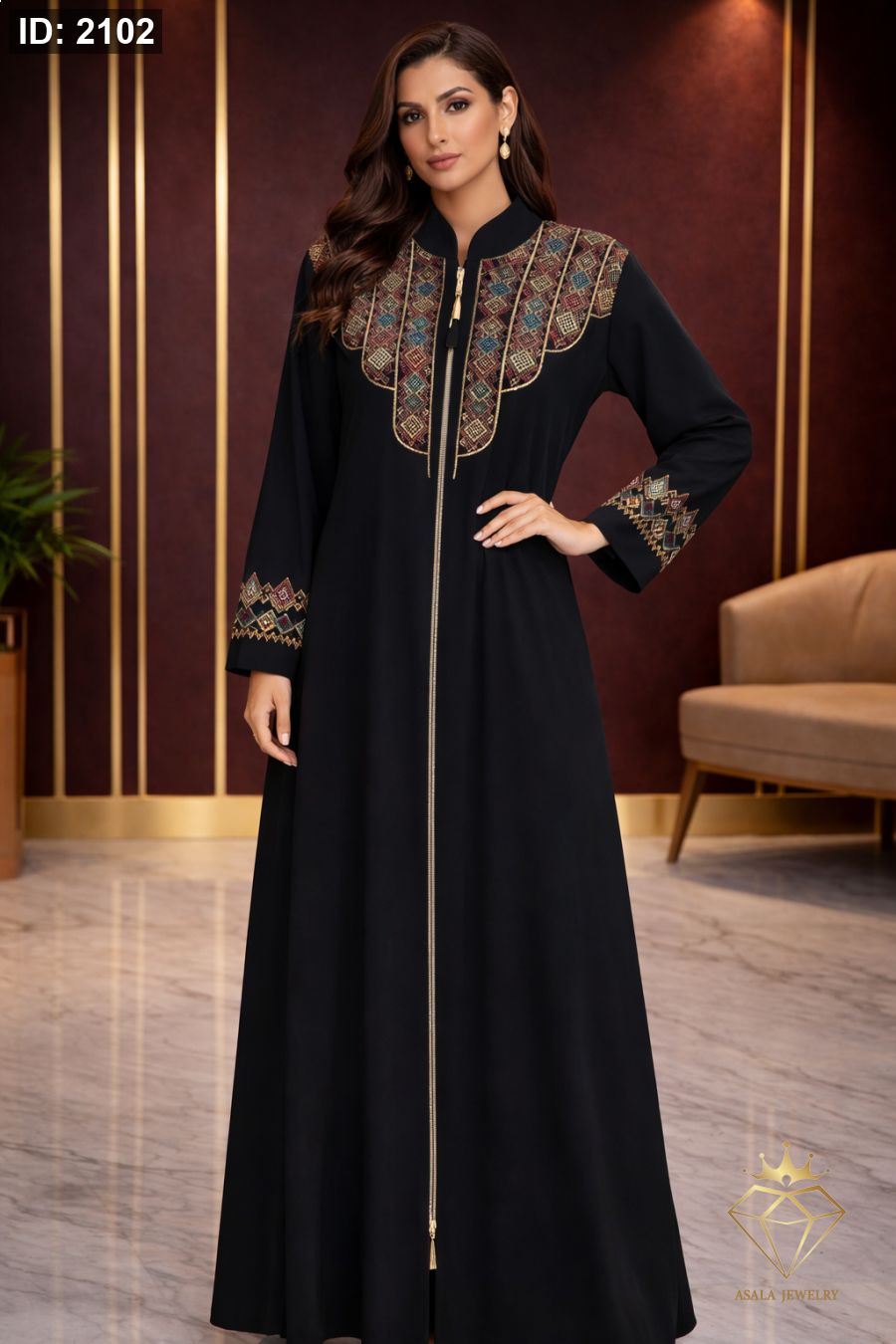 القصة الانسيابية تمنحك حضوراً متزناً ومظهراً رسمياً راقياً، بينما السحاب الأمامي يضيف سهولة في الارتداء ولمسة عملية أنيقة. تصميم مثالي للمناسبات، الاستقبالات، والزيارات الراقية.