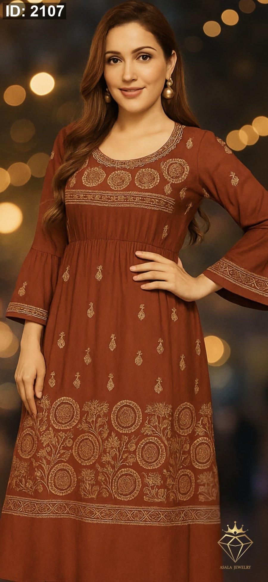 يتميز بقصة مريحة بانسيابية ناعمة مع تحديد خفيف عند الخصر يمنح القوام توازناً أنيقاً، وأكمام واسعة تضيف لمسة أنثوية راقية. التفاصيل المطرزة تعزز حضور القطعة وتمنحها طابعاً مميزاً يناسب المناسبات والزيارات الخاصة.