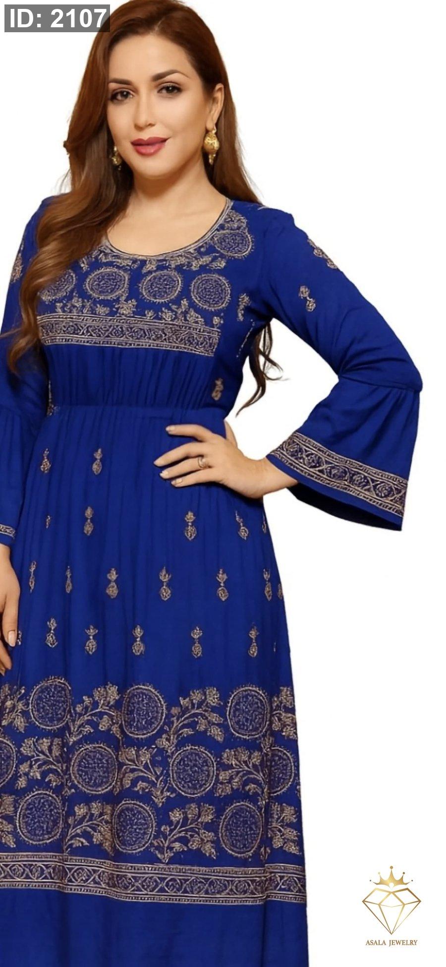 فستان بتصميم مستوحى من الفن التراثي الأصيل، مزين بنقوش دقيقة متناسقة تزين الجزء العلوي والأطراف بأسلوب يعكس فخامة هادئة وذوقاً رفيعاً.