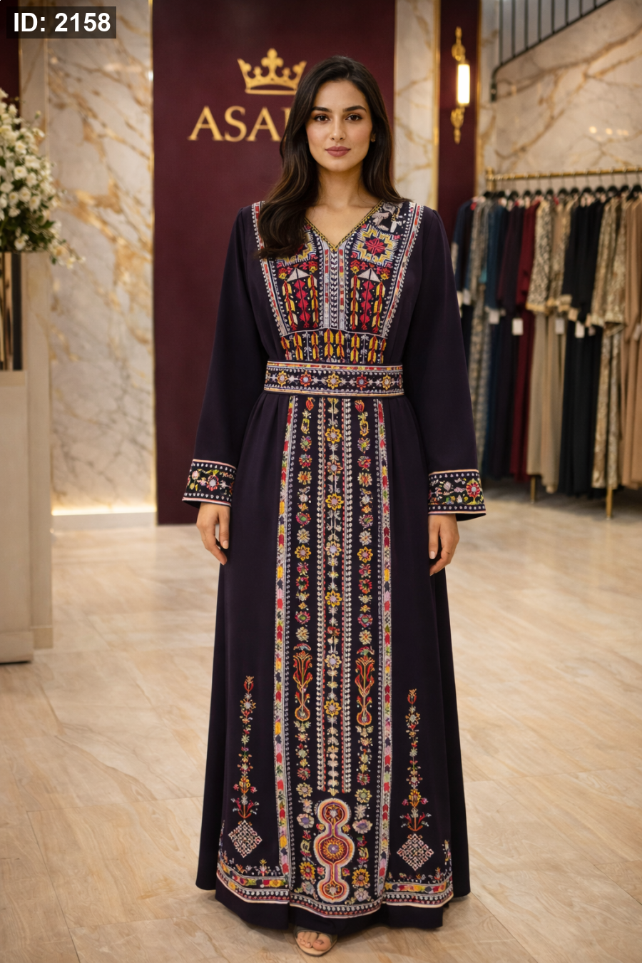 عباية فاخرة مستوحاة من جمال التطريز الفلسطيني الأصيل، تأتي باللون البنفسجي الملكي مع تطريز تراثي غني بالألوان يزين الصدر والأكمام ويمتد حتى أسفل العباية ليمنحها طابعاً فنياً مميزاً.